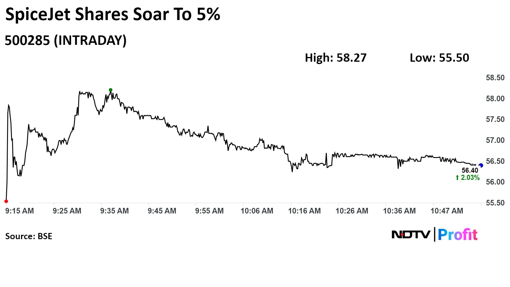 SpiceJet's stock rose as much as 5.41% during the day to Rs 58.27 apiece on the BSE. It was trading 2.06% higher at Rs 56.42 per share, compared to a 0.36% decline in the benchmark Sensex at 10:56 a.m.