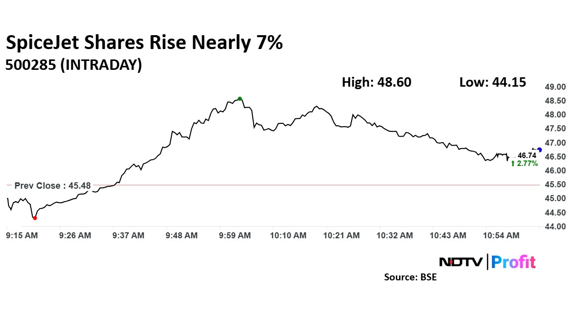 Shares of SpiceJet rose as much as 6.86% to Rs 48.60 apiece, the highest level since March 13. It pared gains to trade 4.33% higher at Rs 47.45 apiece, as of 10:58 a.m. This compares to a 0.46% advance in the BSE Sensex.