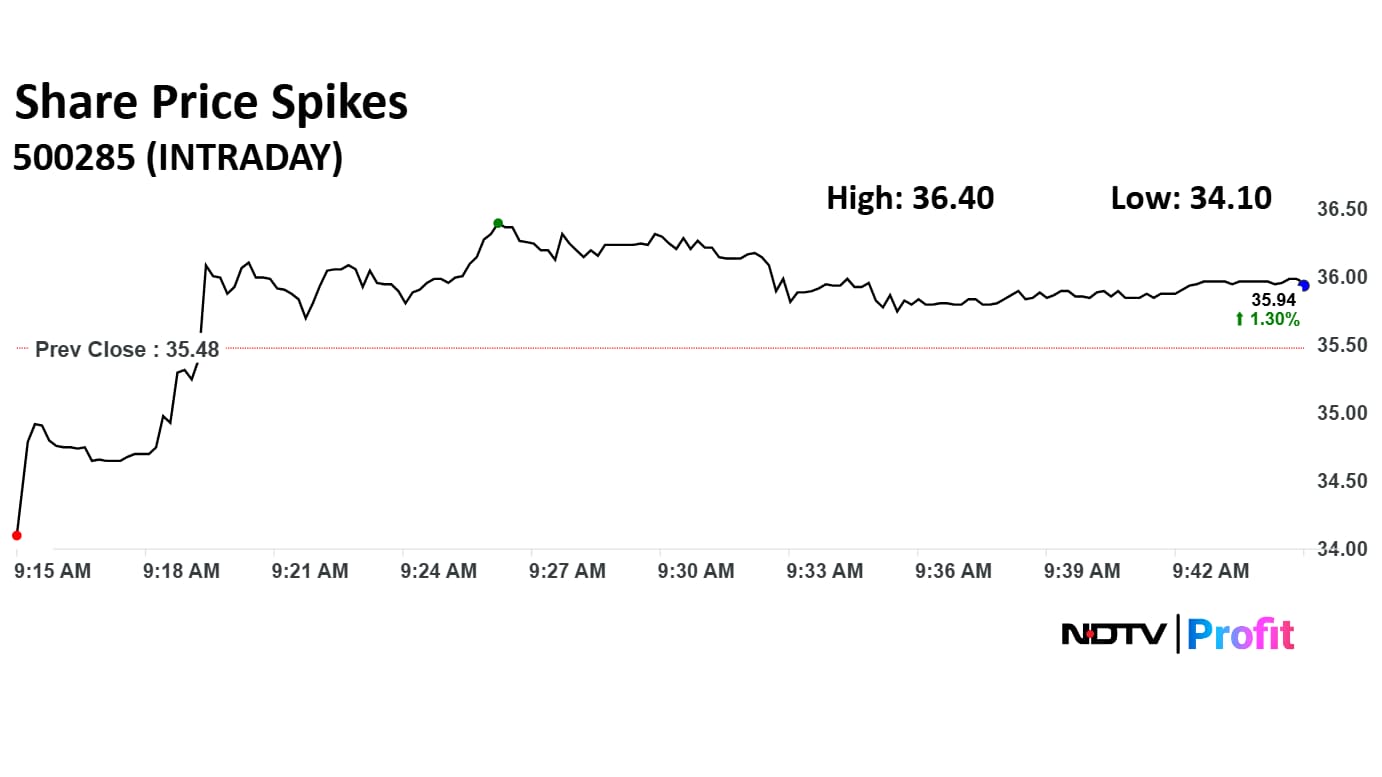 The scrip rose as much as 2.59% to Rs 36.40 apiece. It pared gains to trade 2.28% higher at Rs 36.29 apiece, as of 09:46 a.m. This compares to a flat NSE Nifty 50 Index.