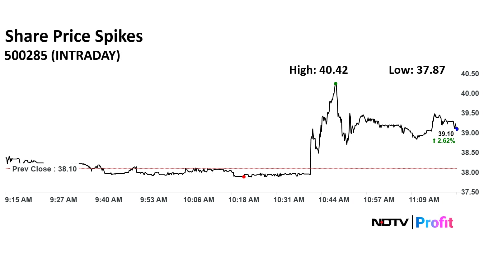 The scrip rose as much as 6.09% to Rs 40.42 apiece. It pared gains to trade 3.12% higher at Rs 39.29 apiece, as of 11:19 a.m. This compares to a 0.185% advance in the NSE Nifty 50 Index.