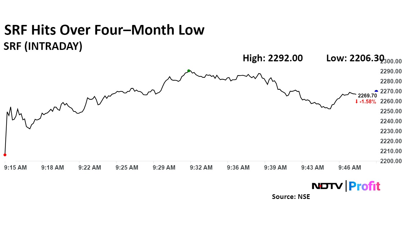 SRF share price declined as much as 4.33% to Rs 2,206.30 apiece, the lowest level since June 5. It pared losses to trade 2.23% lower at Rs 2,254.75 as of 09:55 a.m., as compared to 0.59% decline in the NSE Nifty 50 index.
