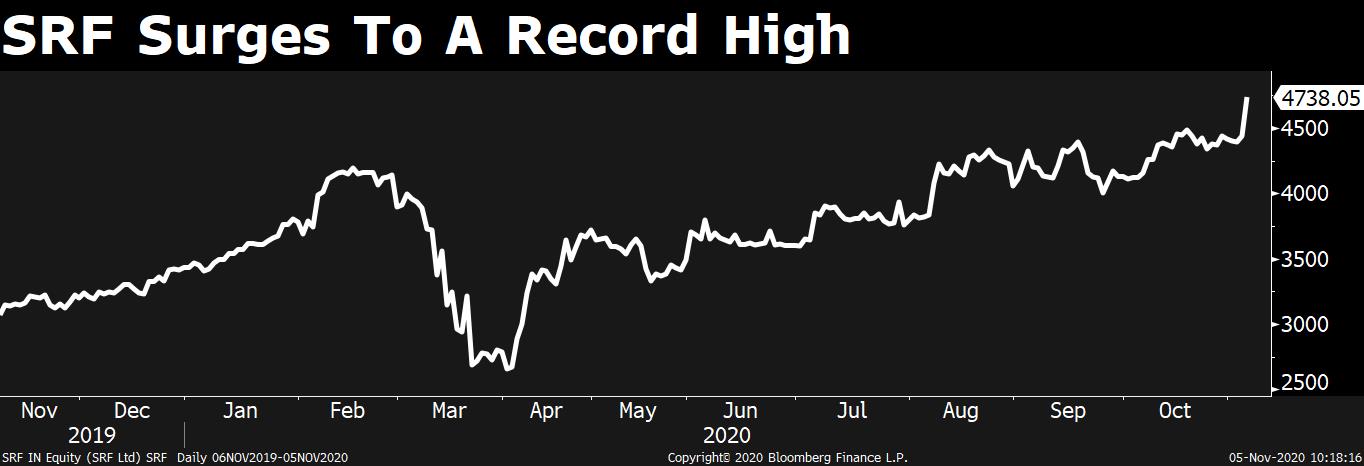 Shares of SRF Ltd. jumped to a record high after the chemical-based industrial intermediates maker saw its quarterly profit surge, aided by its packaging films and specialty chemicals business.