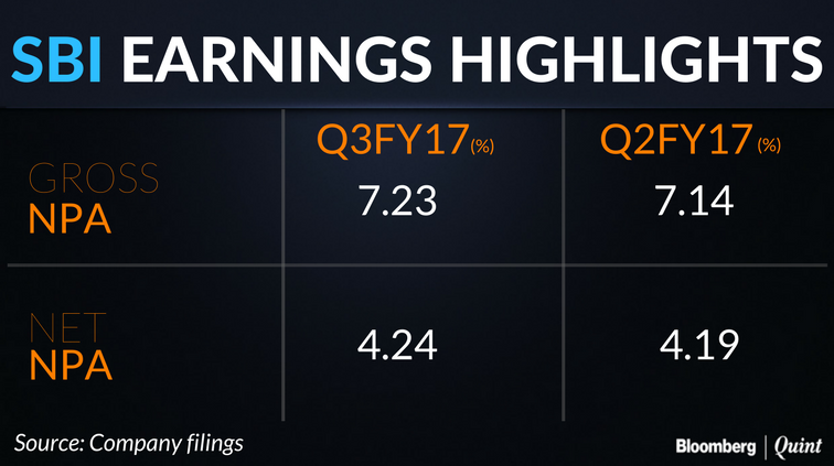 Gross non-performing assets for the bank in absolute terms stood at Rs 1,08,172 crore compared to Rs 1,05,873 crore during the July-September quarter. Percentage of gross non-performing assets in the third quarter stood at 7.23 percent as compared to 7.14 percent in the previous quarter. Net non-performing assets came in at 4.24 percent as against 4.19 percent sequentially.