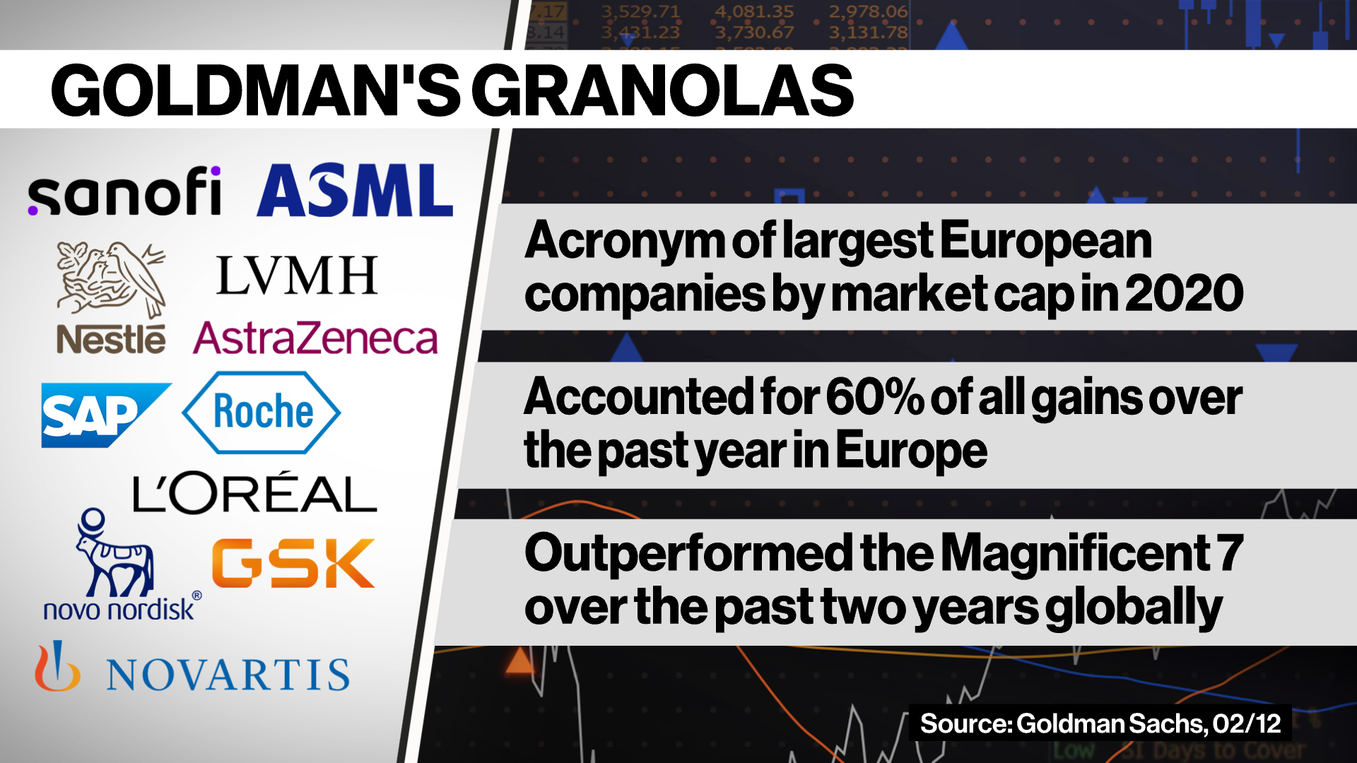 At Goldman Sachs, strategist Sharon Bell expects sectors linked to the economy — such as industrial goods and construction — to benefit from lower energy costs and improving demand. She also sees a brighter outlook, despite higher valuations, for Europe's biggest firms due to their relatively defensive attributes. These comprise the so-called GRANOLAS, including GSK Plc, Roche Holding AG, ASML Holding NV, Nestle SA, Novartis AG, Novo Nordisk A/S, L'Oreal SA, LVMH, AstraZeneca Plc, SAP SE and Sanofi.