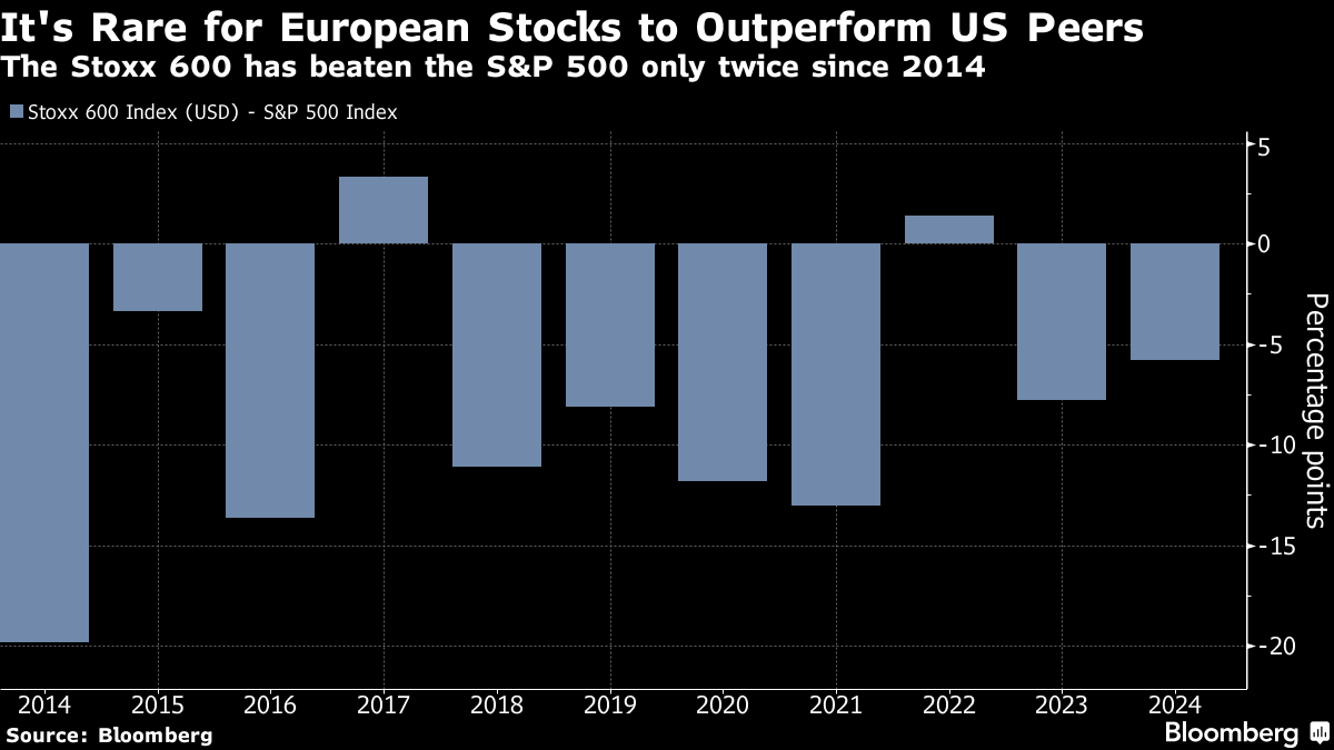The odds still look stacked against Europe, however. The Stoxx Europe 600 Index has gained 2.6% this year, inching toward a record high last hit in January 2022. In dollar terms, it's down 0.2%, trailing the US benchmark S&P 500 Index — which is at an all-time peak. And a year when Europe outpaces Wall Street would be an outlier — it has happened only twice in the last decade.