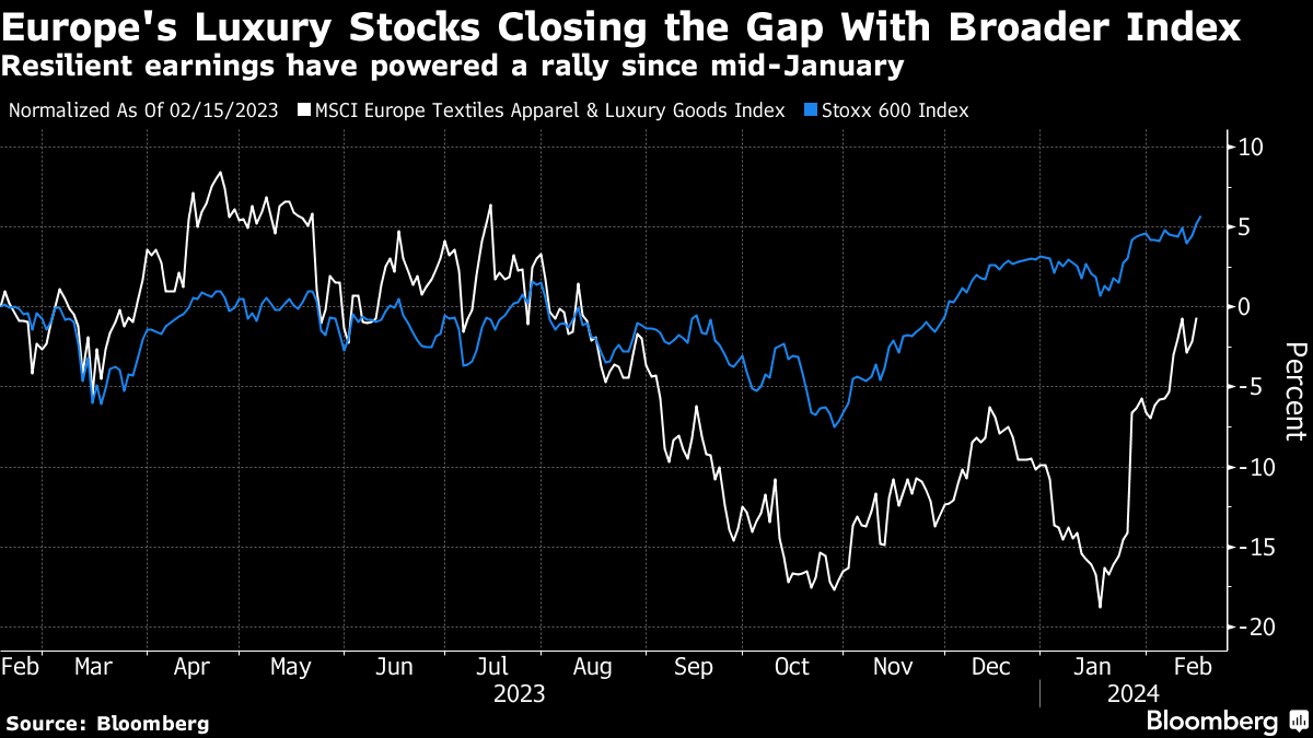 Europe's luxury stocks are also set for a revival, with help from strong US consumers, Bell said. Resilient earnings at LVMH have already dispelled worries about slowing China demand — a key market for the sector — and fueled a 22% surge in the MSCI Europe Textiles Apparel & Luxury Goods Index the since mid-January.