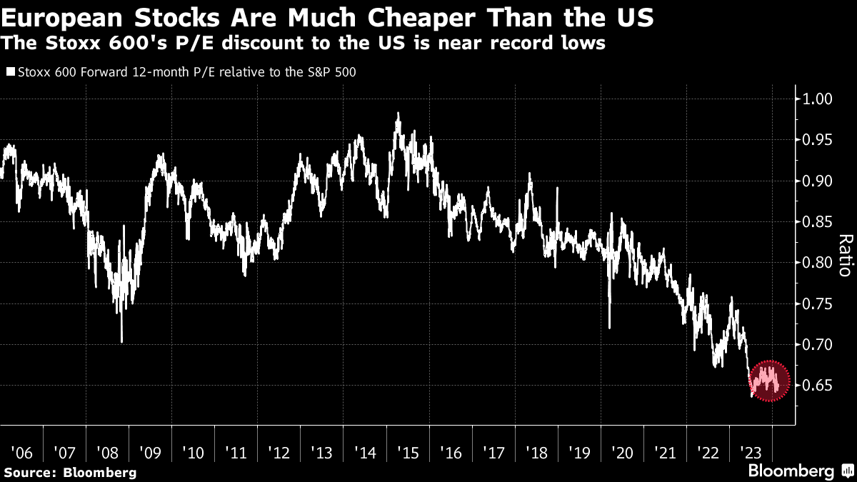 Stock valuations and expectations of a pickup in European business activity are also big drivers of the optimism. The Stoxx 600's forward 12-month price-to-earnings ratio is near a record low relative to the S&P 500.