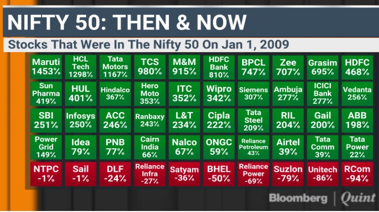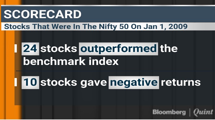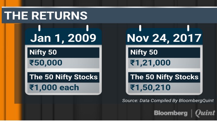 At least, that's what a BloombergQuint analysis shows. The Nifty 50 rose 3.4 times since Dec. 31, 2008. Had an investor parked Rs 50,000 in Nifty and Rs 1,000 each in the 50 index constituents then, the combined investment in the stocks would have fetched 24 percent higher returns than the benchmark gauge.