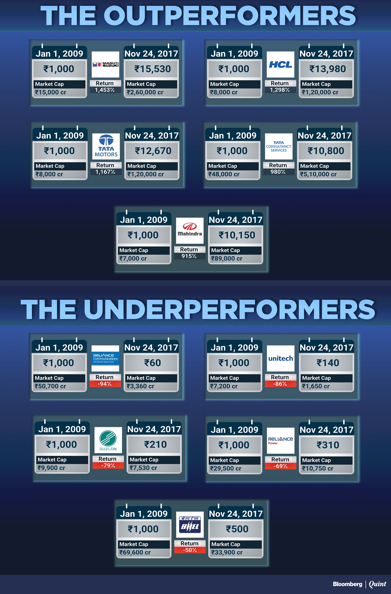Unitech Ltd., once India's second largest real estate company by market capitalisation, was hit by the 2G scam revelations which dented its share price by 86 percent. A Rs 1,000 investment in Unitech in January 2009 would be worth only Rs 140 today. An equivalent investment in Suzlon, Reliance Power and BHEL would have left investors with Rs 210, Rs 310 and Rs 500, respectively.
