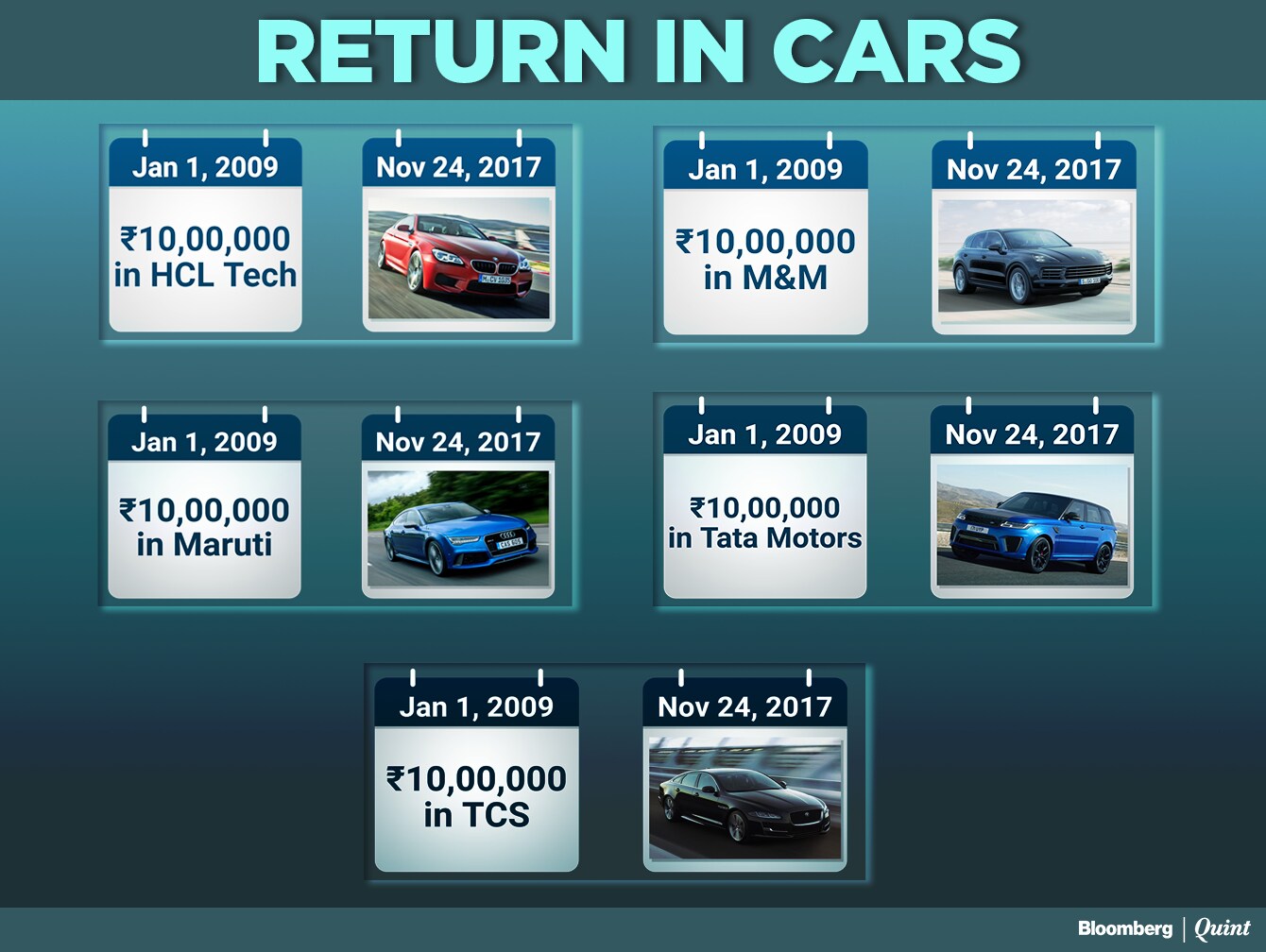 Investments in stocks like HCL Tech, Tata Motors, TCS and M&M have multiplied more than 10 times since 2009. Rs 1,000 invested in HCL Tech would have become Rs 13980, Tata Motors would have yielded Rs 12,670, and an investment in TCS would have increased to Rs 10,800 and M&M would have yielded Rs 10,150.