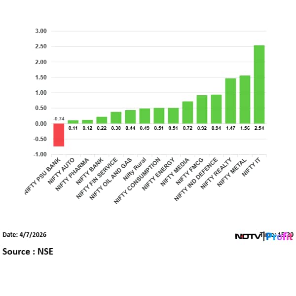 Fourteen out of 15 sectoral gauges compiled by the NSE rally, led by the NSE Nifty IT Index's 2.5% gains. On the flipside, the NSE Nifty PSU Bank Index was the top sectoral loser, down 0.7%.