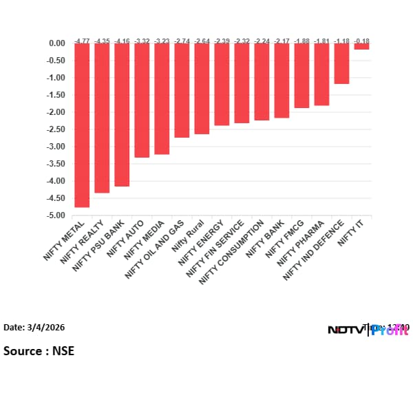 Fourteen out of 15 sectoral gauges compiled by the NSE ended lower, led by the NSE Nifty Metal Index's 4% fall. On the flipside, the NSE Nifty IT Index was the only sectoral gainer, up 0.1%.