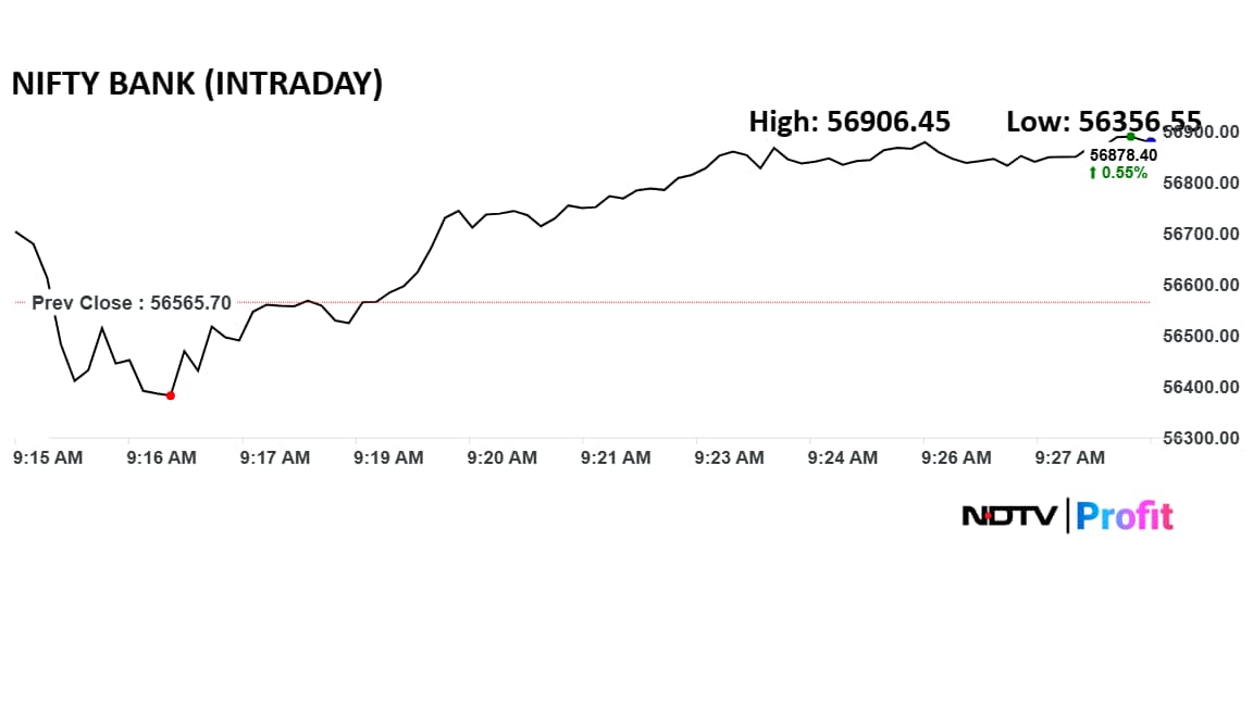 The index rose 0.55% to 56,878.40 after touching a low of 56,356.55. It hit an intraday high of 56,906.45.