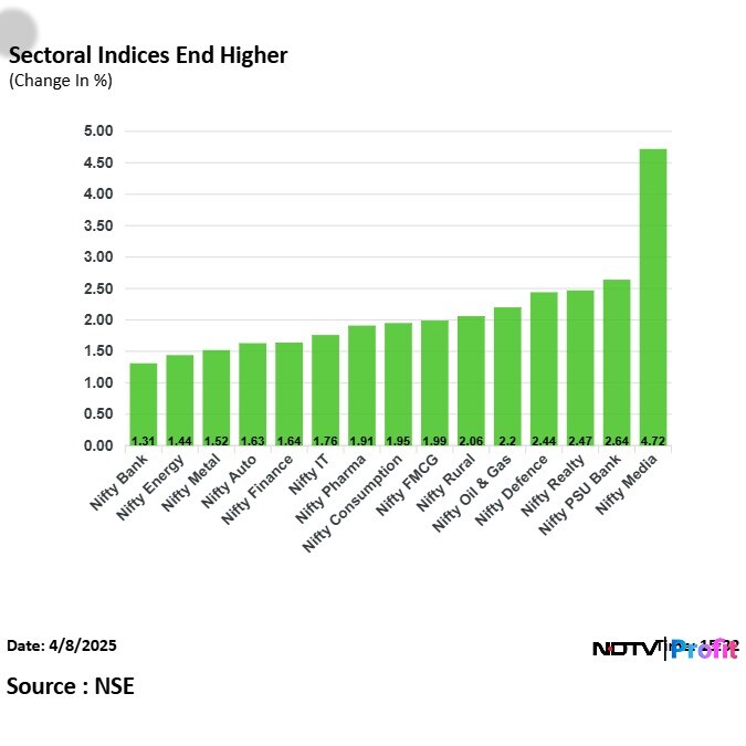 The NSE Nifty 50 ended 374.25 points or 1.69% higher at 22,535.85, while the BSE Sensex closed 1,089.18 points or 1.49% higher at 74,227. Intraday, Nifty 50 rose as much as 2.42% to 22,697.20. This is the highest percentage gain since Nov. 22, 2024. Sensex was up 1,721.49 points to 74,859.39, highest percentage gains since June 3, 2024.