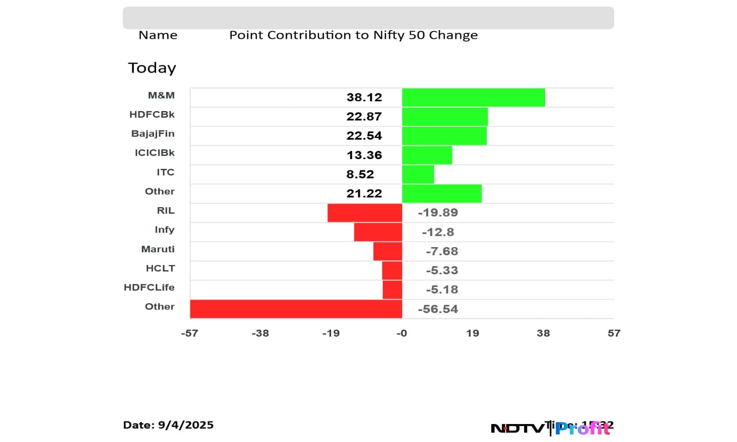 In terms of points contribution, Mahinda & Mahindra Ltd., HDFC Bank, Bajaj Finance, ICICI Bank contributed the most to the gains in the Nifty.