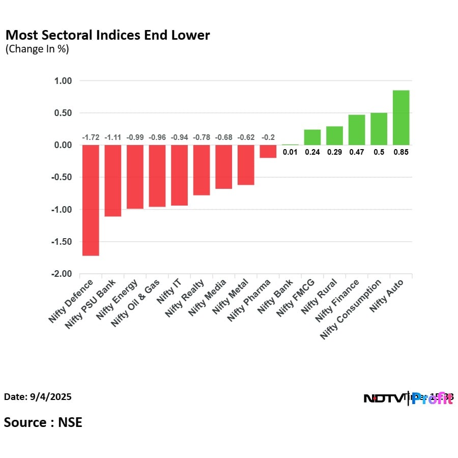 Six out of the 15 sectors on the NSE closed in the green, while Nifty Defence, PSU Bank, Energy and Oil & Gas closed lower.