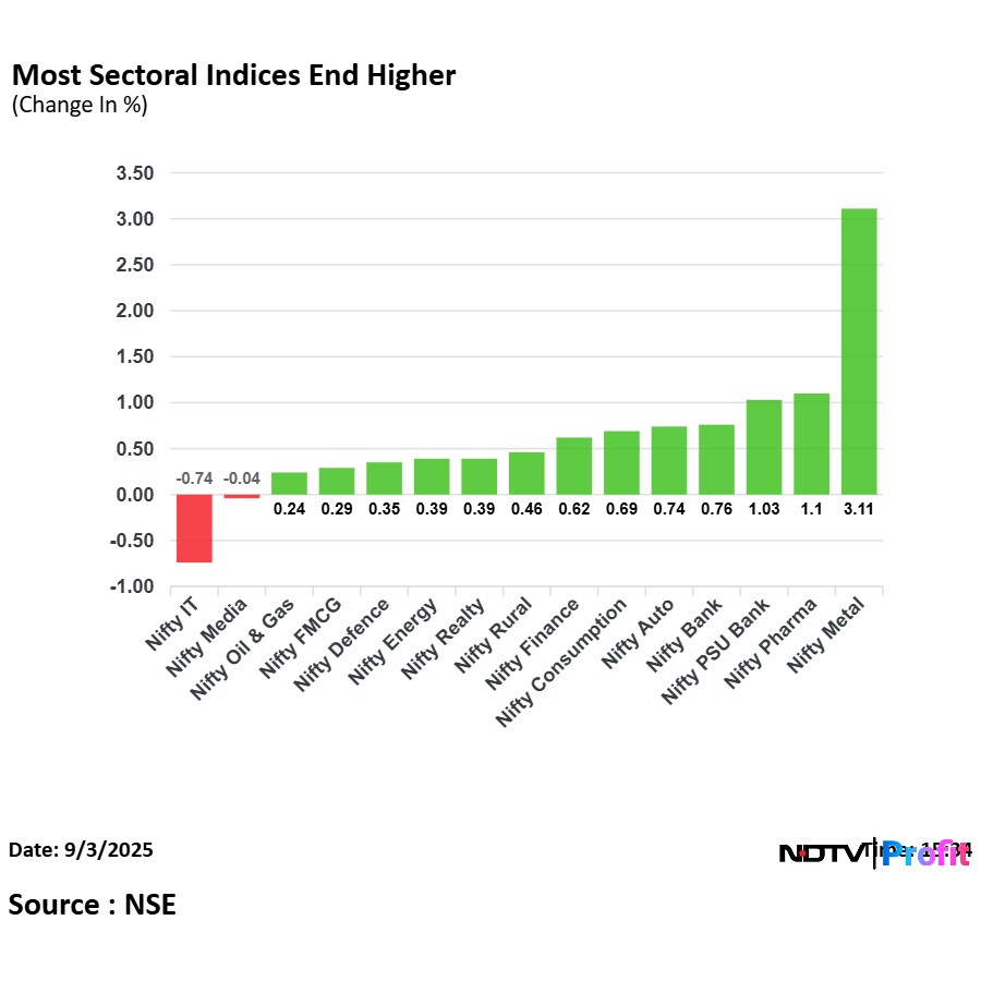 Thirteen out of the 15 sectors on the NSE closed in the green, with the Nifty Metal, Pharma and PSU Bank rising the most.
