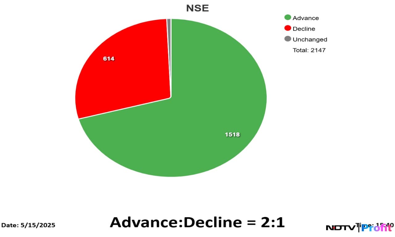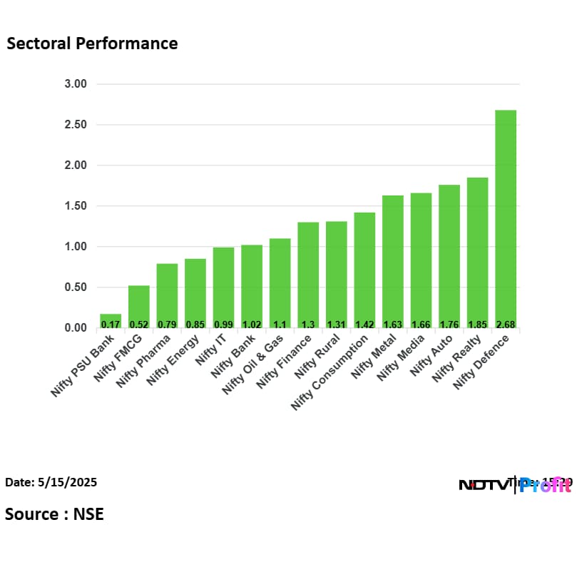 On the NSE, all 15 sectoral indices ended with gains, with the Nifty Defence, Realty and Auto being the top gainers.