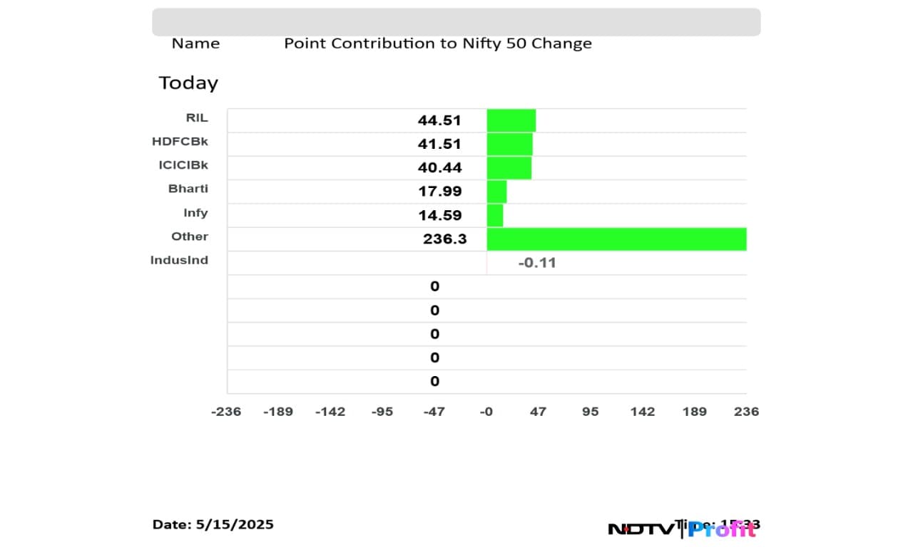 In terms of points contribution, RIL, HDFC Bank, ICICI Bank, Bharti Airtel Ltd. and Infosys Ltd. led the gains in the index.