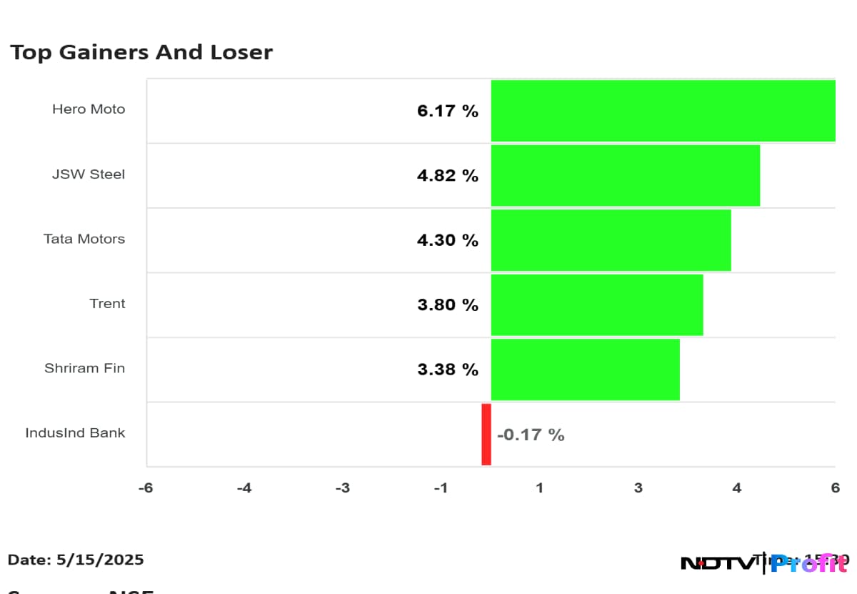 Shares of Hero MotoCorp., JSW Steel Ltd., Tata Motors Ltd., Trent Ltd., and Shriram Finance Ltd. were the top gainers among the Nifty 50 stocks.