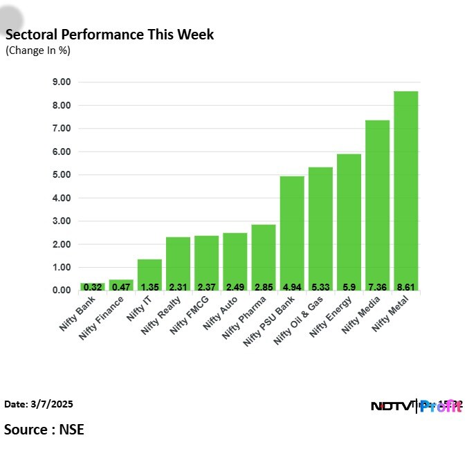 The Nifty Metal was the top gaining sectoral index for the week. The Nifty Pharma, Auto, IT, Finserv and Bank snapped their three-week losing streaks. The Nifty FMCG snapped its four-week losing streak.