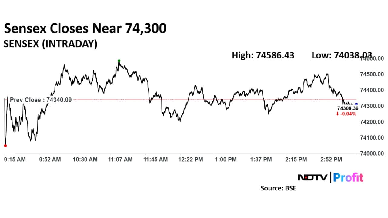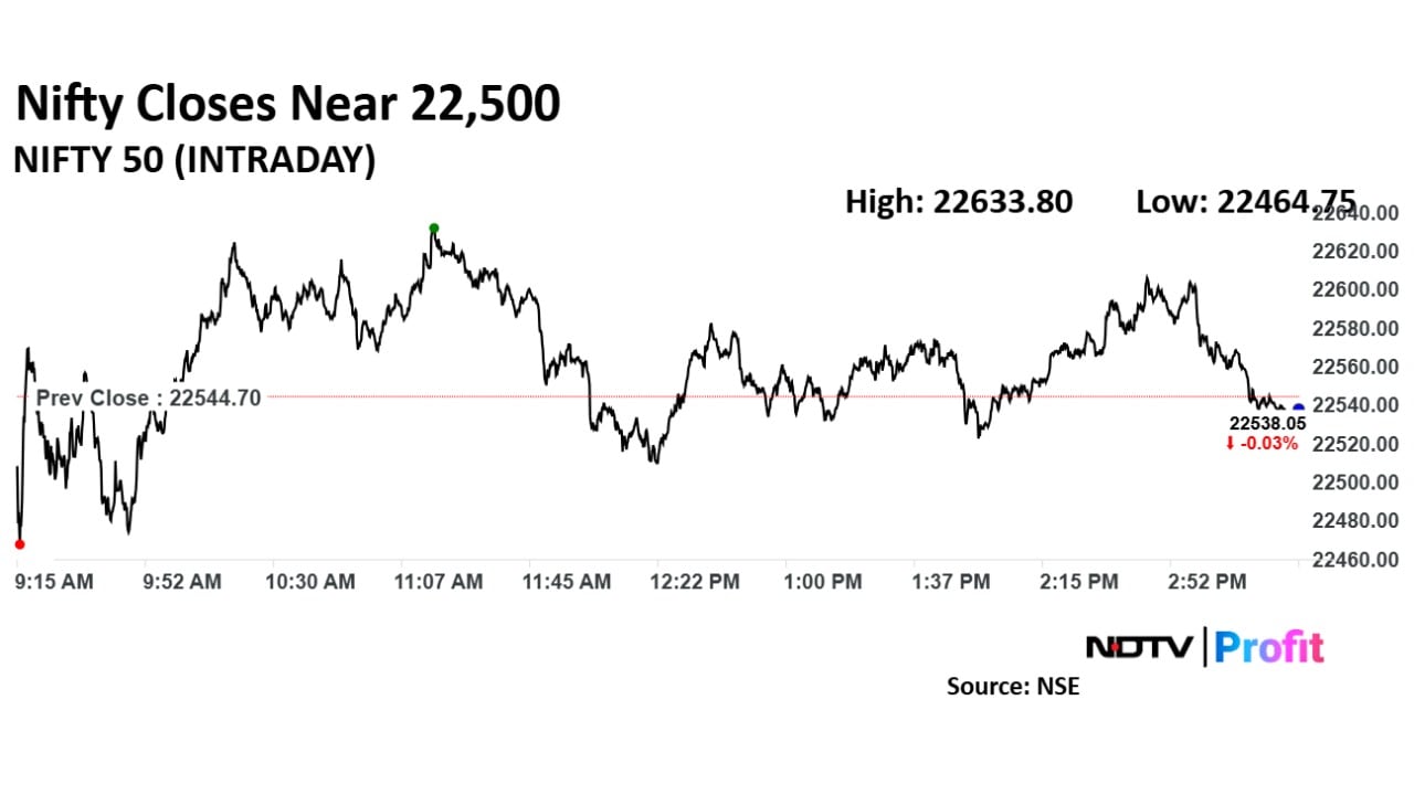 The Nifty ended 7.8 points or 0.03% higher at 22,552.5, while the BSE Sensex closed 7.51 points or 0.01% down at 74,332.58.