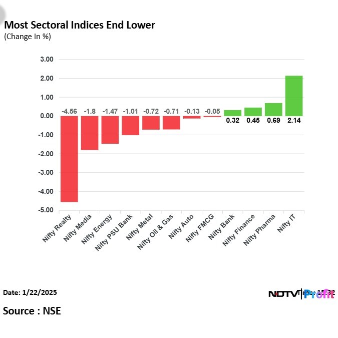 Nine out of the 12 sectors on the NSE declined, with Nifty Realty and Nifty Media falling the most on Wednesday. Nifty IT rose the most in trade.