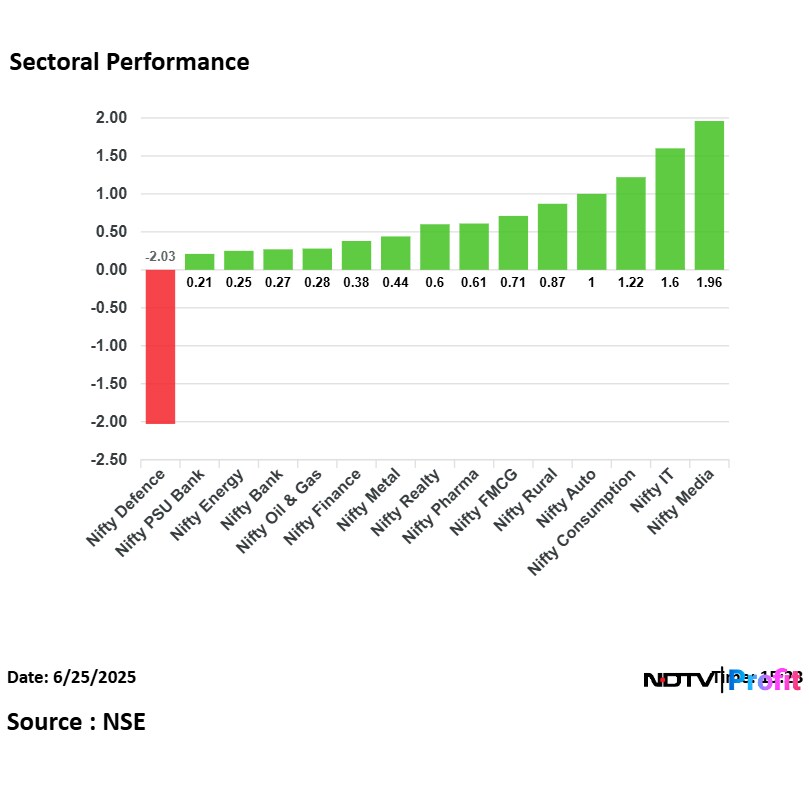 On NSE, 14 out of 15 sectors ended in the green, with Nifty Media, IT and Consumption gaining the most.