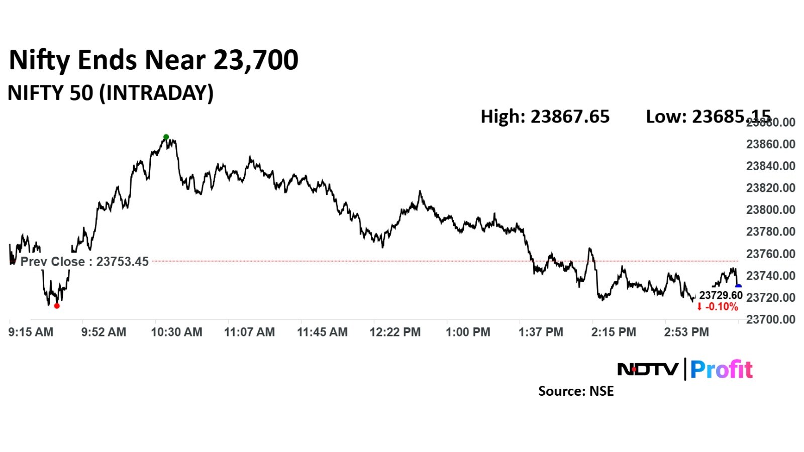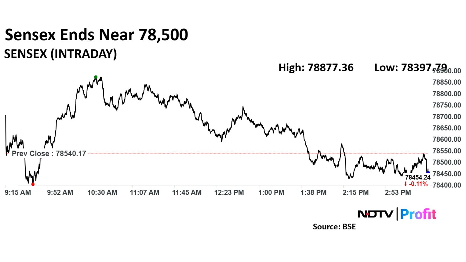 The NSE Nifty 50 ended 25.80 points or 0.11% down at 23,727.65 and the BSE Sensex settled 67.30 points or 0.1% lower at 78,472.87. During the day, the Nifty rose 0.48% to 23,867.65, while the Sensex advanced 0.43% to 78,877.36.