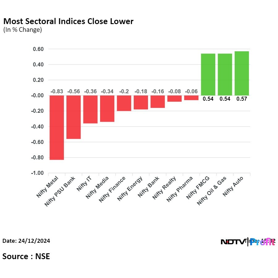 On the NSE, nine sectors declined and three advanced out of 12, with the Nifty Metal declining the most and Auto rising the most.