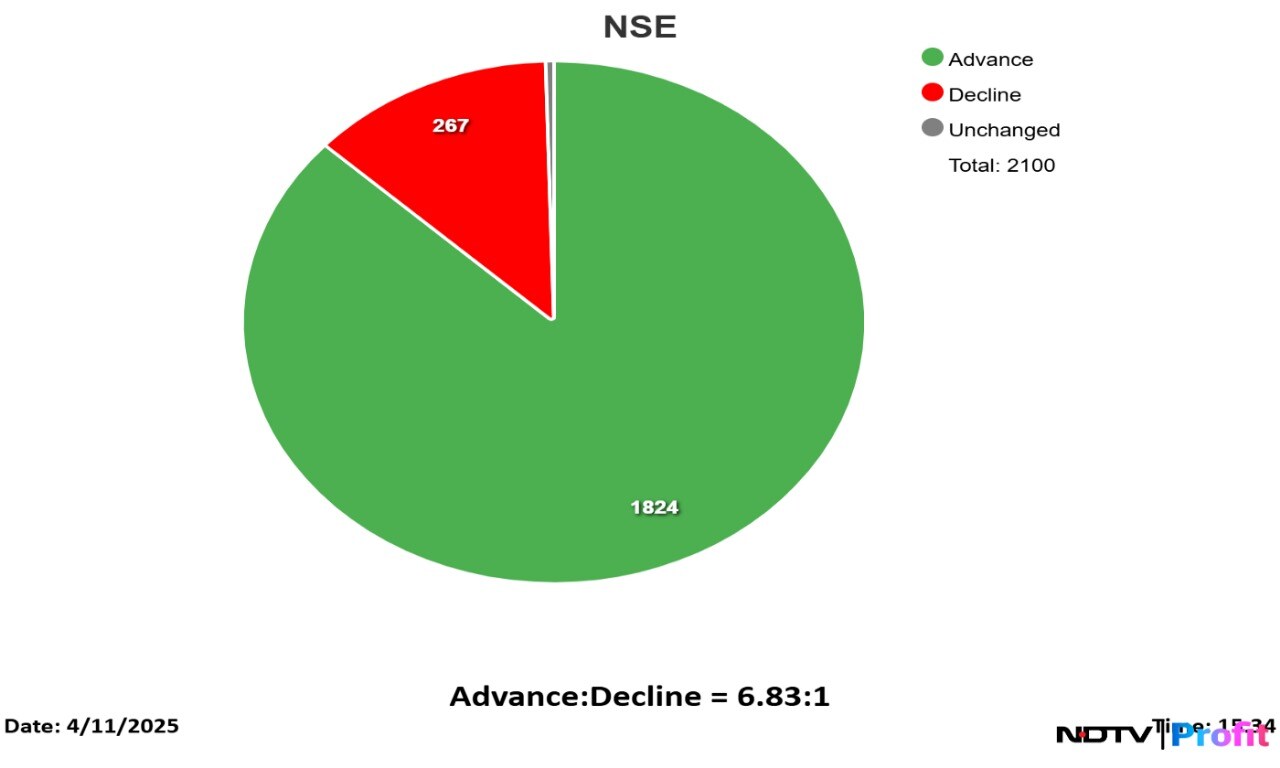 The market breadth was skewed in favour of the buyers with 3,119 stocks advancing and 116 remaining unchanged on the BSE.