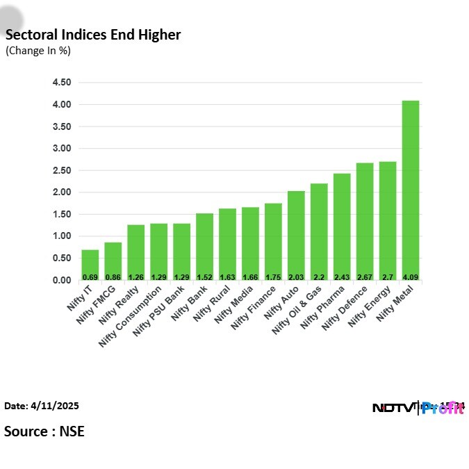 On the NSE, all the 15 sectors rose, with the Nifty Metal and Energy leading the gains.