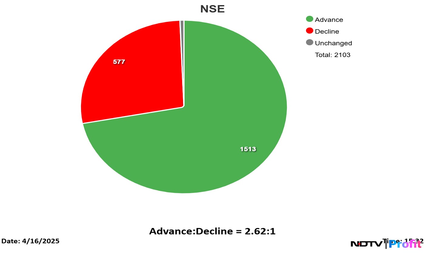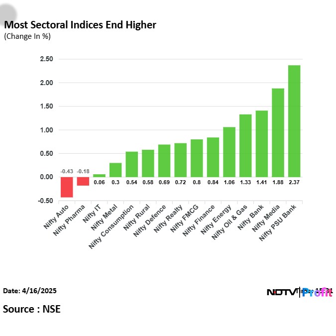 As benchmark indices ended with gains, 13 out of 15 indices on the NSE ended with gains. Among the top gainers was Nifty PSU Bank which surged 2.34%, followed by Nifty Media which gained 1.77% and Nifty Bank which rose 1.4%.