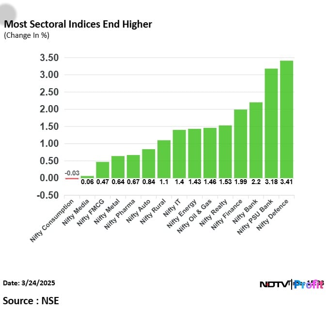 Eleven out of the 12 sectors on the National Stock Exchange rose, with the Nifty Defence and PSU Bank gaining the most. The Nifty Defence ended in the green for the seventh consecutive day, marking the longest winning streak since December.
