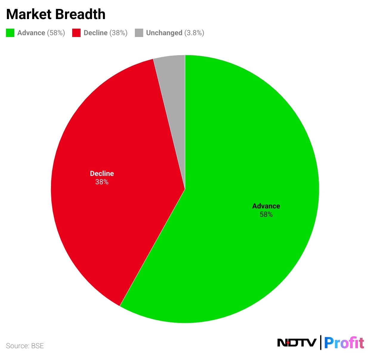 The market breadth was skewed in favour of the buyers as 1,637 stocks declined, 2,497 advanced and 164 remained unchanged on the BSE.