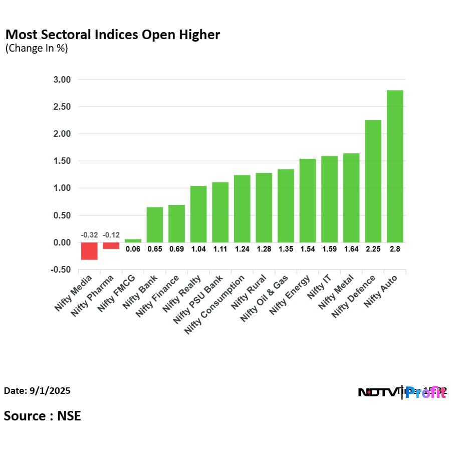 Thirteen out of the 15 sectors on the NSE closed in the green, with the Nifty Auto and Defence gaining the most.