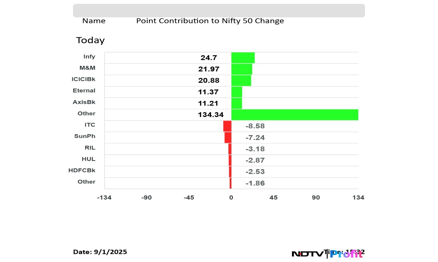 In terms of points contribution, Infosys, Mahindra & Mahindra, ICICI Bank, Eternal and Axis Bank contributed the most to the gains in the Nifty.