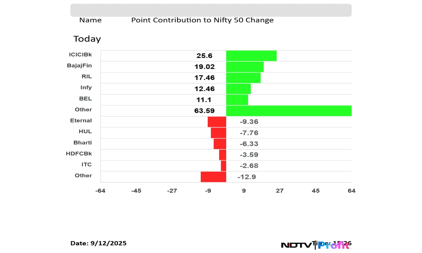 In terms of points contribution, ICICI Bank Ltd., Bajaj Finance Ltd., Reliance Industries Ltd., Infosys Ltd. and Bharat Electronics Ltd. contributed the most to the gains in the Nifty.
