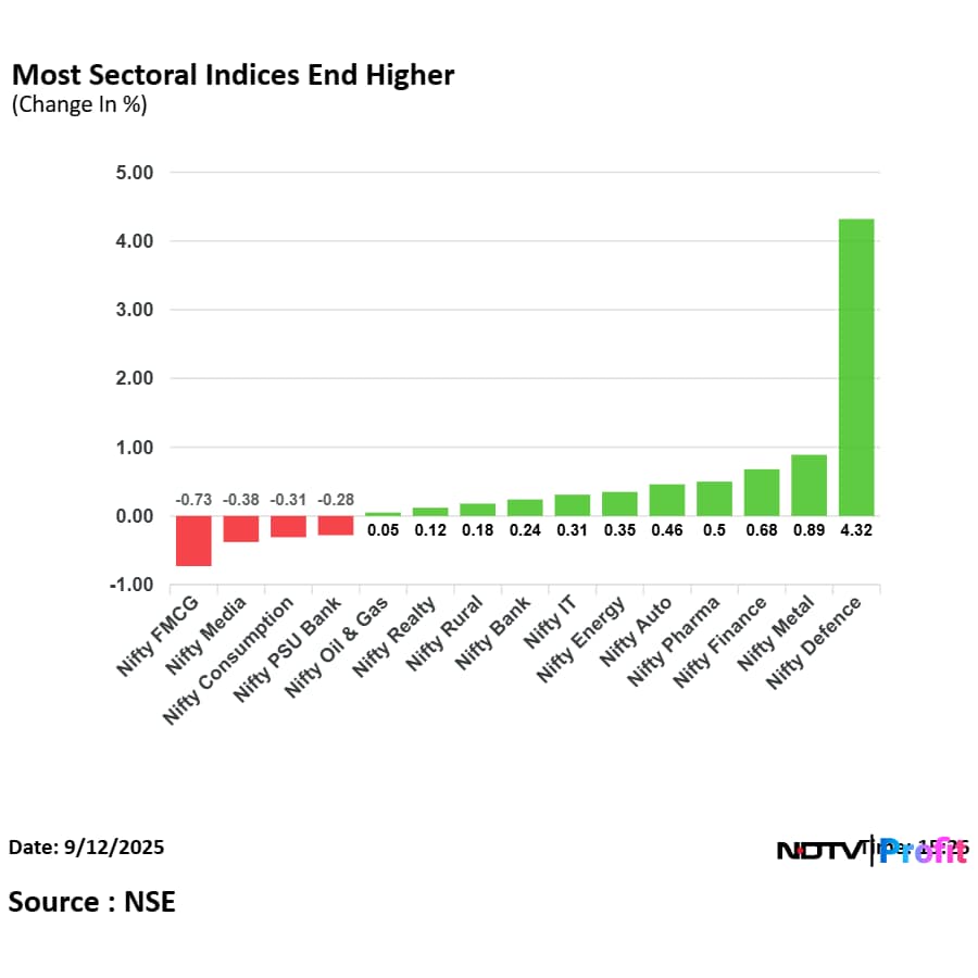 Eleven out of the 15 sectors on the National Stock Exchange closed in the green, with the Nifty Defence, Metal and Finance leading the gains. The Nifty FMCG, Media, Consumption and PSU Bank ended in the red.