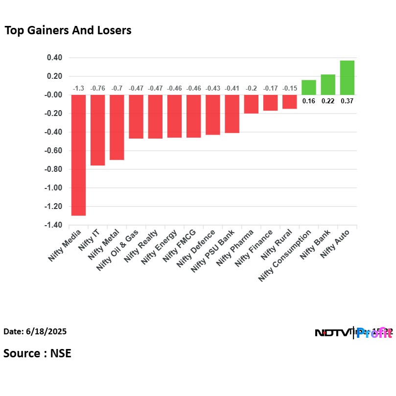 On the NSE, 12 out of the 15 sectors ended in the red, with Nifty Media, IT and Metal declining the most.