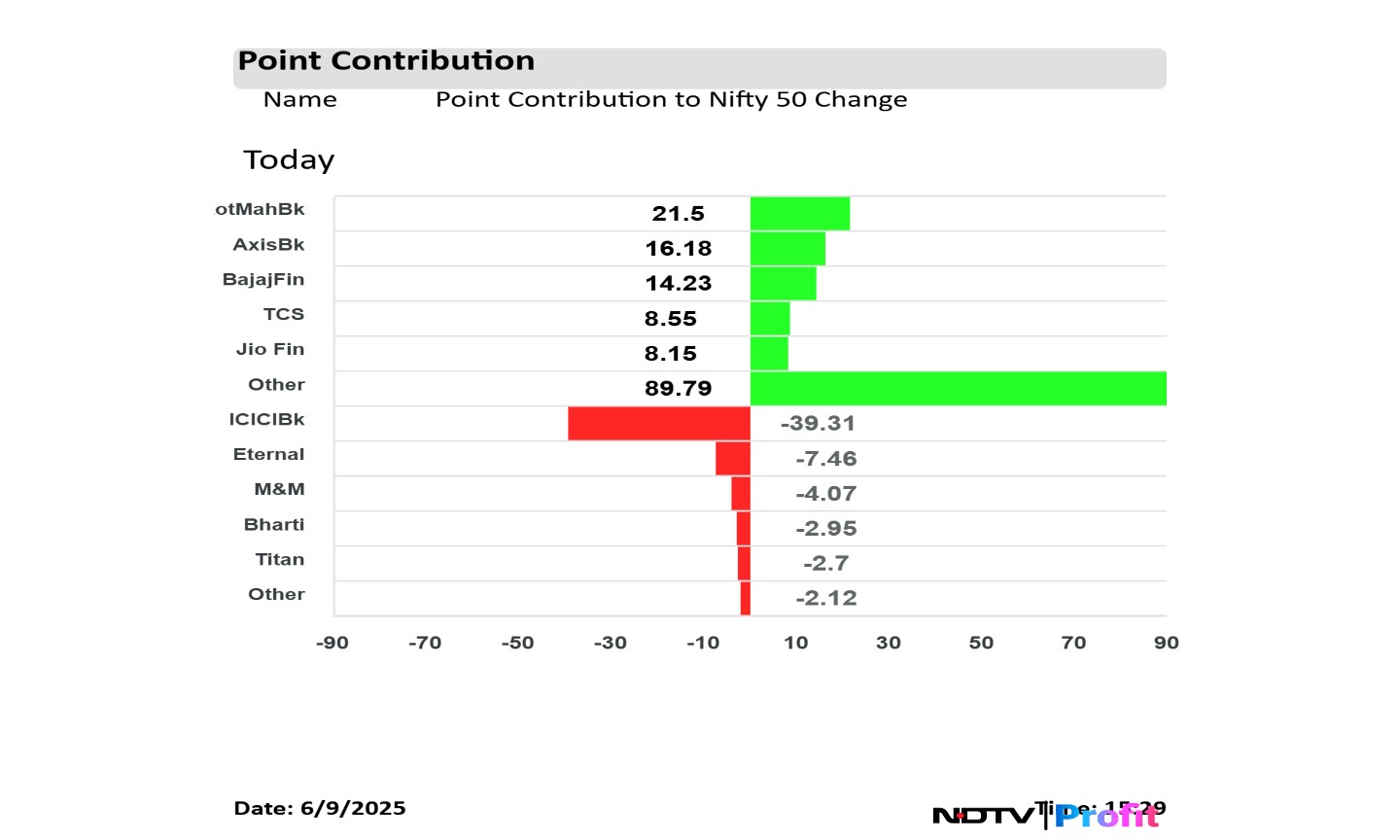In terms of points contribution, Kotak Mahindra Bank Ltd. and Axis Bank Ltd. were among stocks that led gains in the index.
