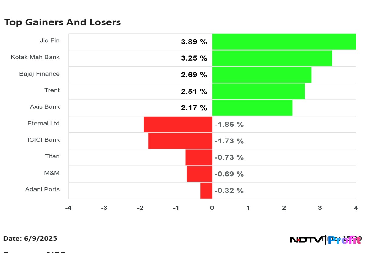 Shares of Jio Financial Services Ltd., Kotak Mahindra Bank Ltd. and Bajaj Finance Ltd. were the top gainers.