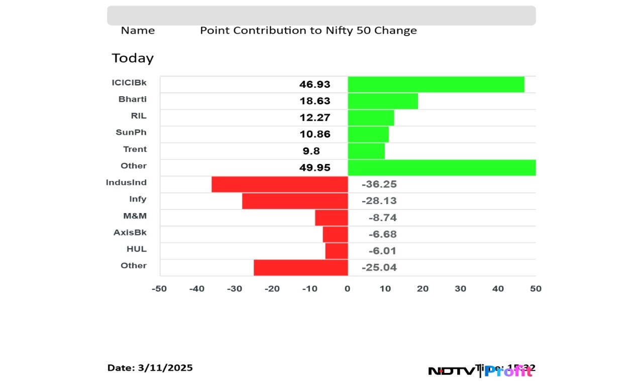 Shares of ICICI Bank, Bharti Airtel, Reliance Industries Ltd., Sun Pharmaceutical Industries Ltd. and Trent Ltd. led the gains.