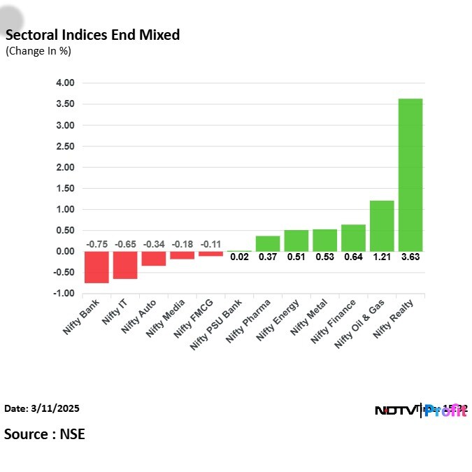 Seven out of the 12 sectors on the NSE advanced, with Nifty Realty and Oil & Gas rising the most. The Nifty Realty snapped a three-session losing streak, while Auto fell for the second day.
