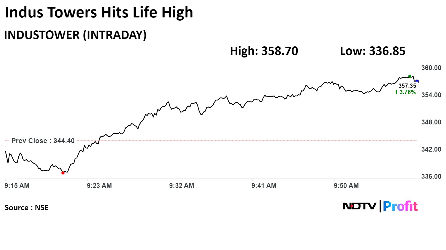 Shares of Indus Towers Ltd. rose 4.15%, the highest level since its listing on Dec. 28, 2012, before paring some gains to trade 4.02% higher at 10:02 a.m. This compares to a 0.45% decline in the NSE Nifty 50.
