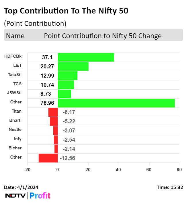 HDFC Bank Ltd., Larsen & Toubro Ltd., Tata Steel Ltd., Tata Consultancy Services Ltd., and JSW Steel Ltd. added to the upward movement in the index.