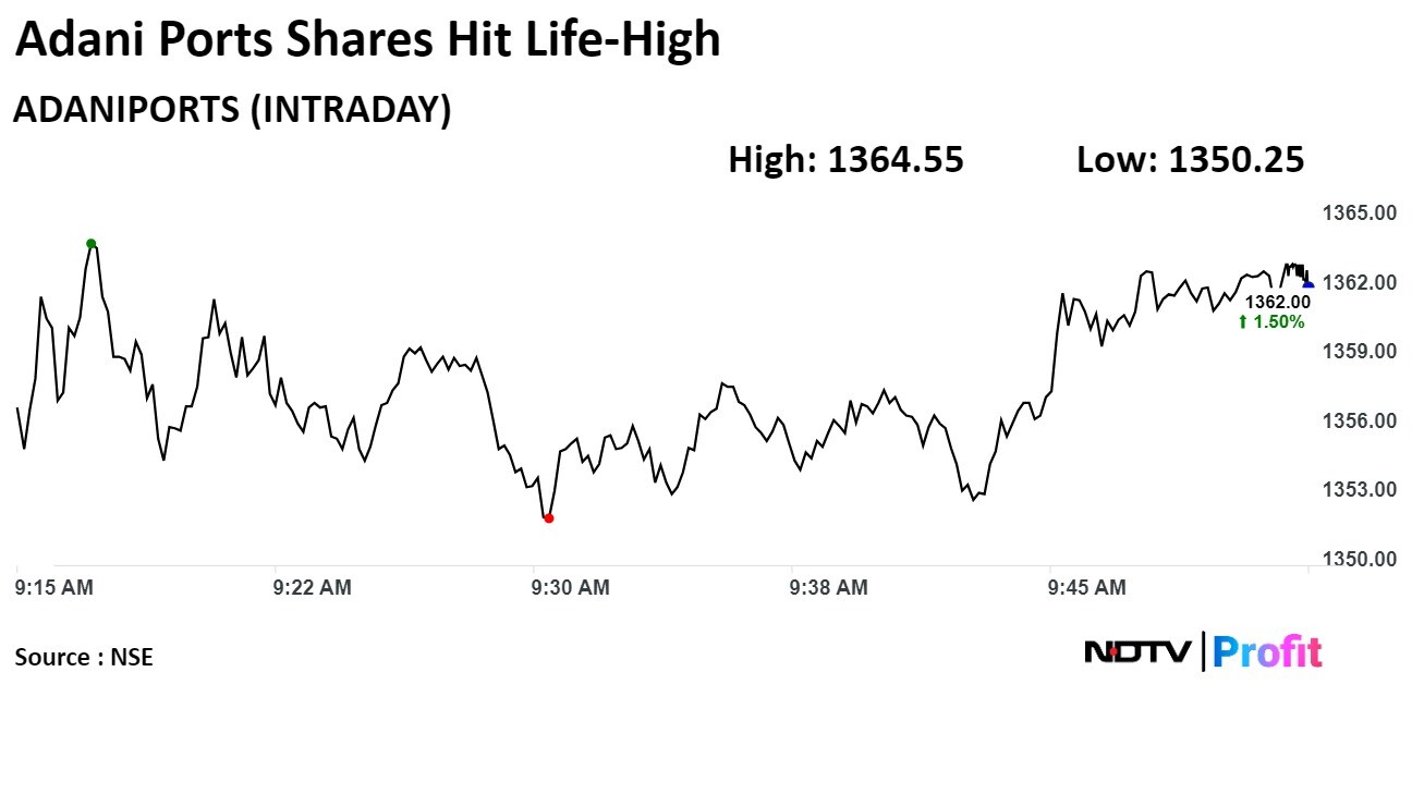 Adani ports stock rose as much as 1.69% during the day to hit an life-high of Rs 1364.55 apiece on the NSE. It was trading 1.54% higher at Rs 1362.5 apiece, compared to a 0.74% advance in the benchmark Nifty 50 as of 9:50 a.m.
