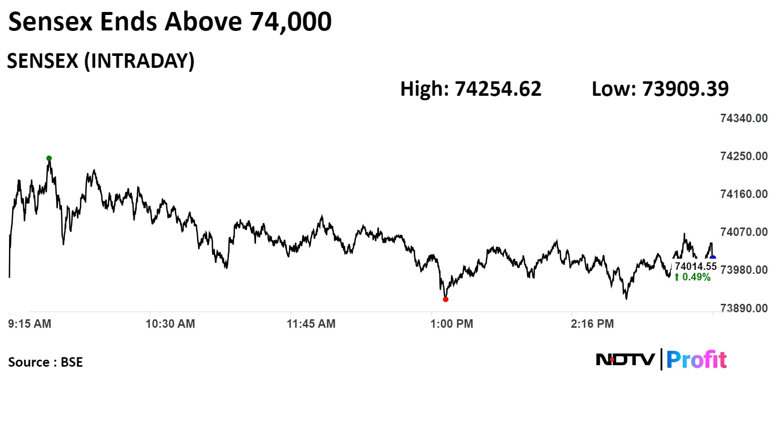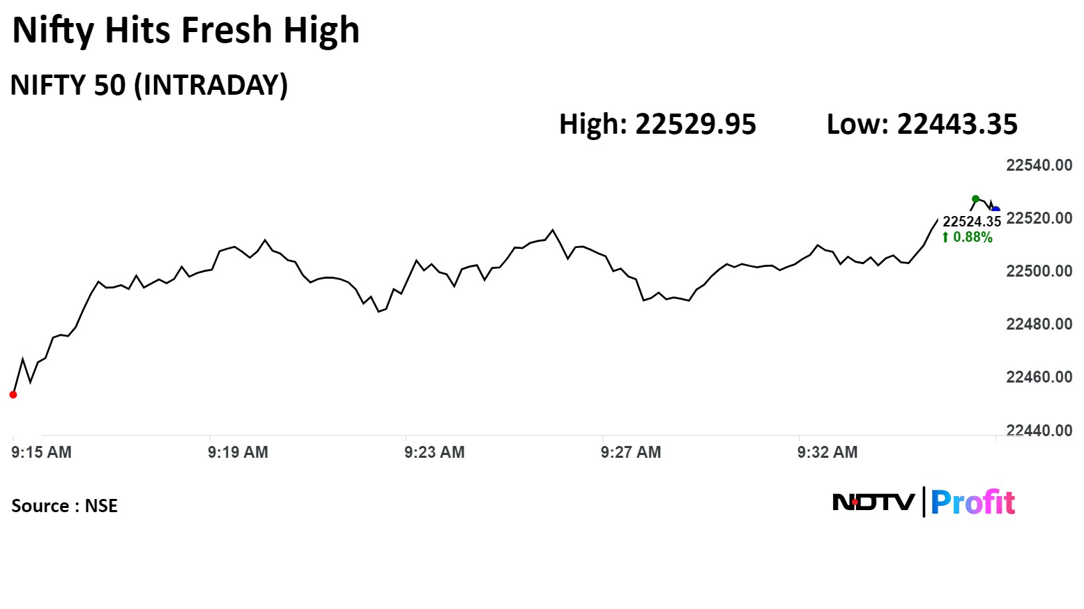 Intraday, the NSE Nifty 50 rose 0.91% to life time high of 22,529.95, and the S&P BSE Sensex rose 0.82% to record high of 74,254.62.