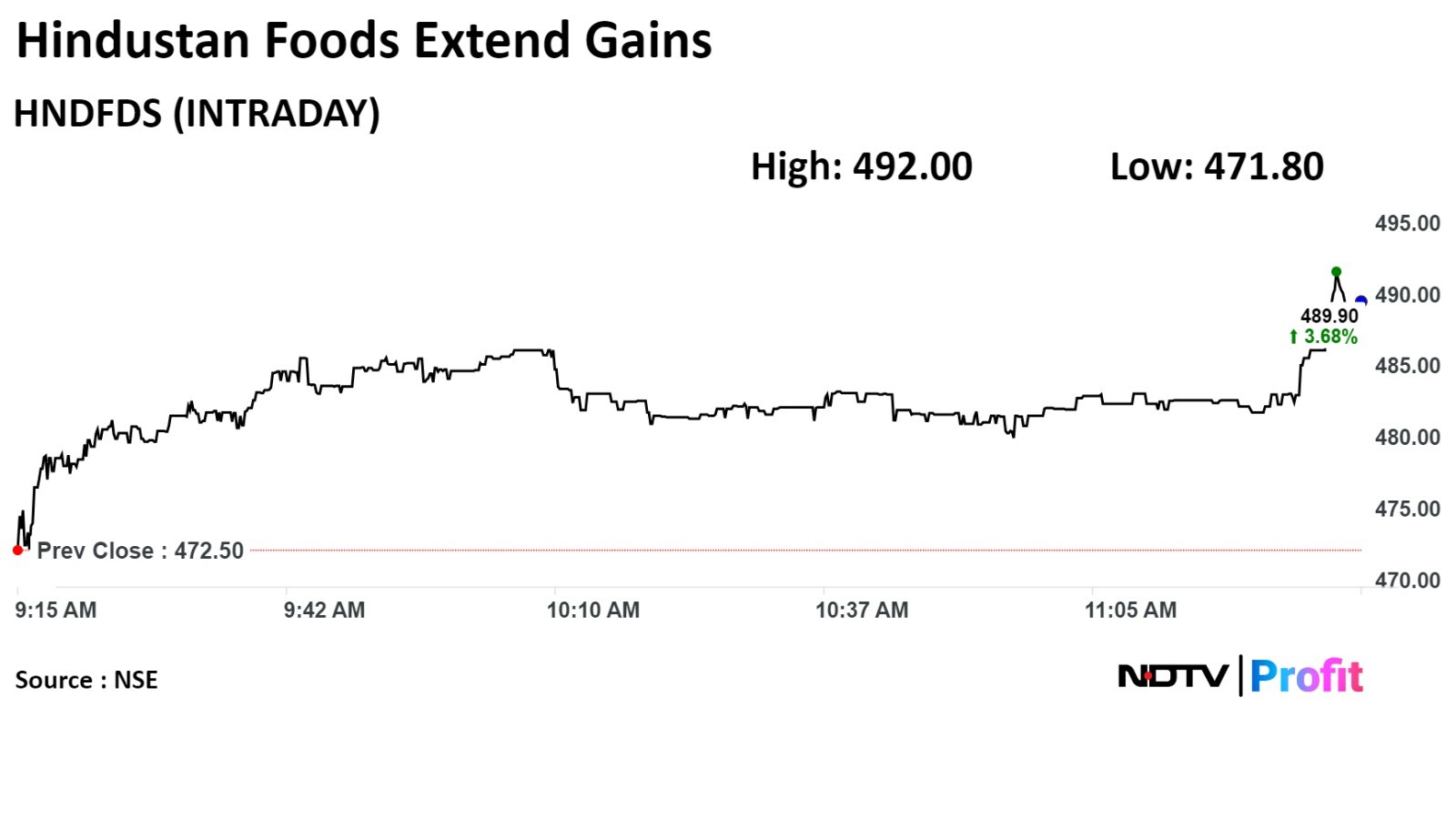 Shares of Hindustan Foods Ltd. rose as much as 4.13% to Rs 492.00, the highest level since March 21. It was trading 2.96% higher at Rs 486.50 as of 11:38 a.m., as compared to 0.66% advance in the NSE Nifty 50 index.