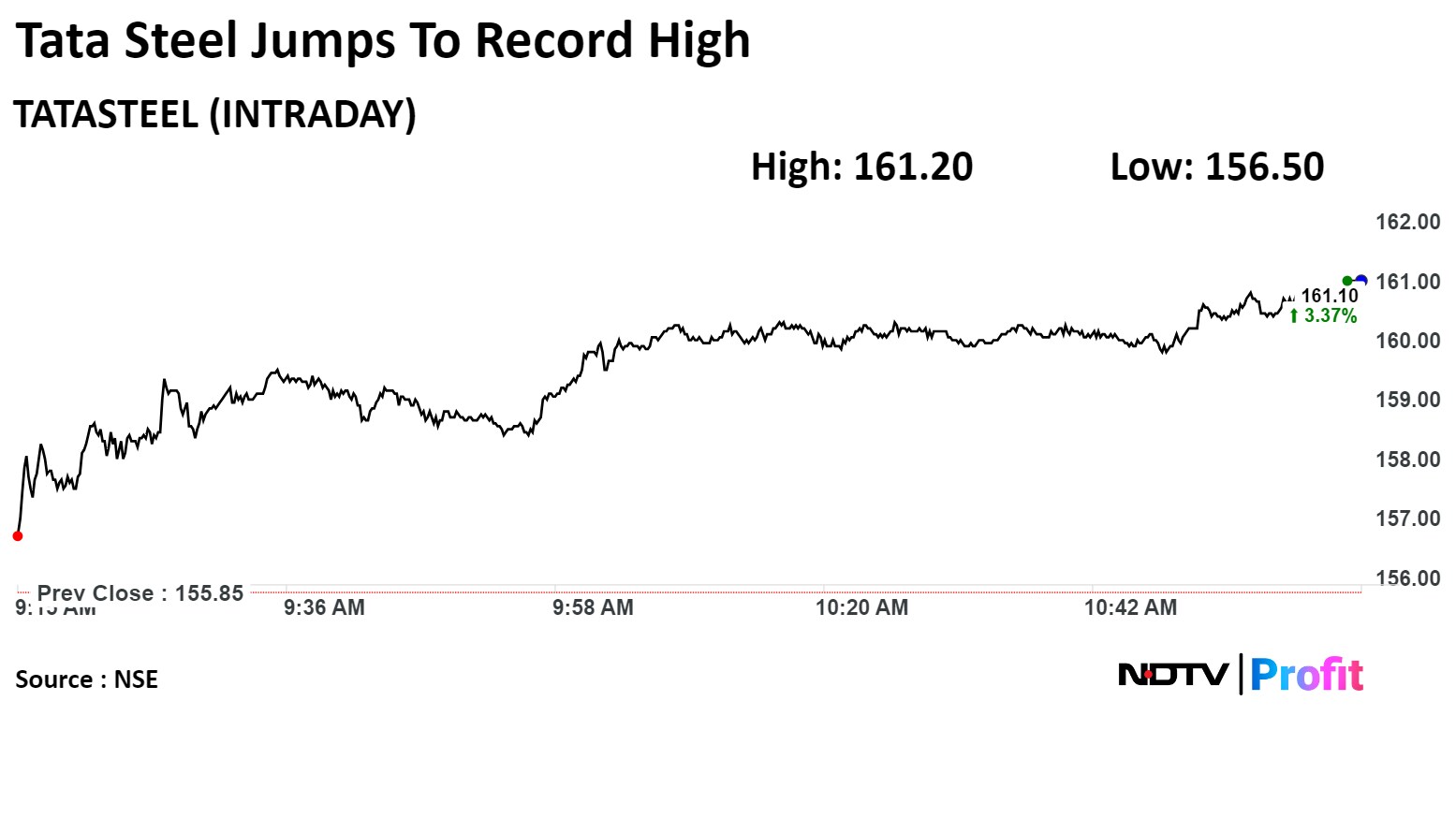 Tata Steel Ltd. rose as much as 3.43% to Rs 161.20, the highest level since its listing on Nov 18, 1998. It was trading 3.37% higher at Rs 161.10 as of 11:06 a.m. as compared to 0.63% advance in the NSE Nifty 50.